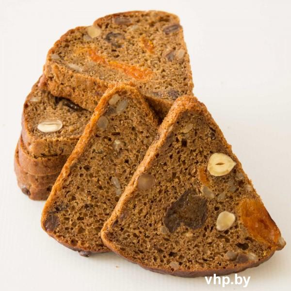 Состав: мука ржаная хлебопекарная сеяная, вода питьевая, мука пшеничная второго сорта, ядро ореха фундука, абрикос сушеный, слива сушеная, виноград сушеный, солод ржаной сухой, концентрат квасного сусла, инвертный сироп, ядро семян подсолнечника, дрожжи прессованные, семена тыквы, соль йодированная.
